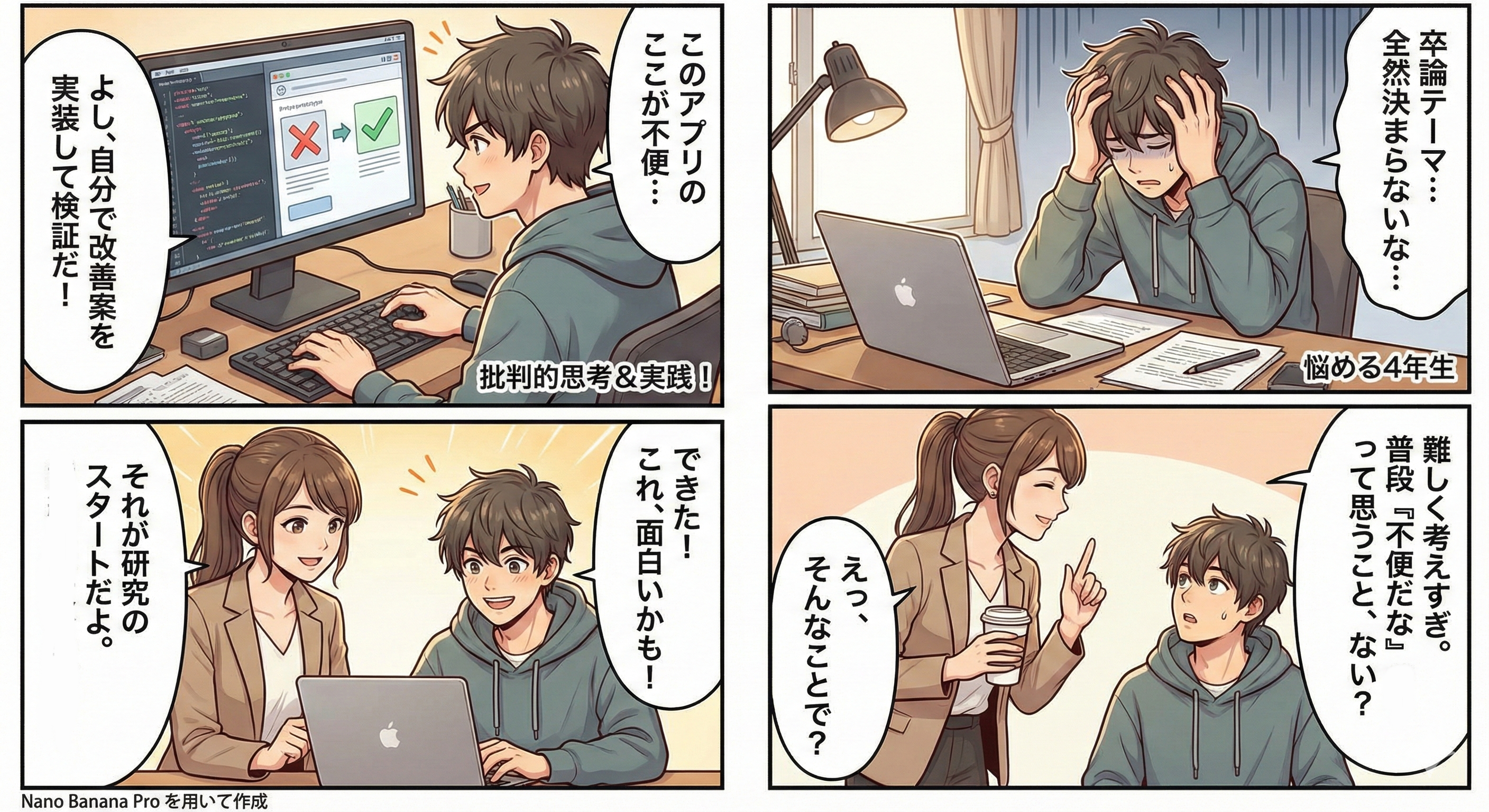 自分で取り組める課題を見つける力が研究の出発点となる。「この教材は使いにくい」という気づきから教育アプリの開発研究につなげる,といった例がある。「なぜそうなるのか」と問い続けることで研究が深まる。