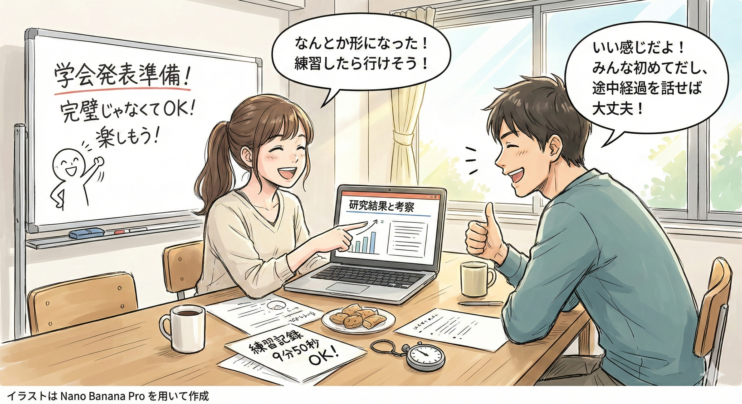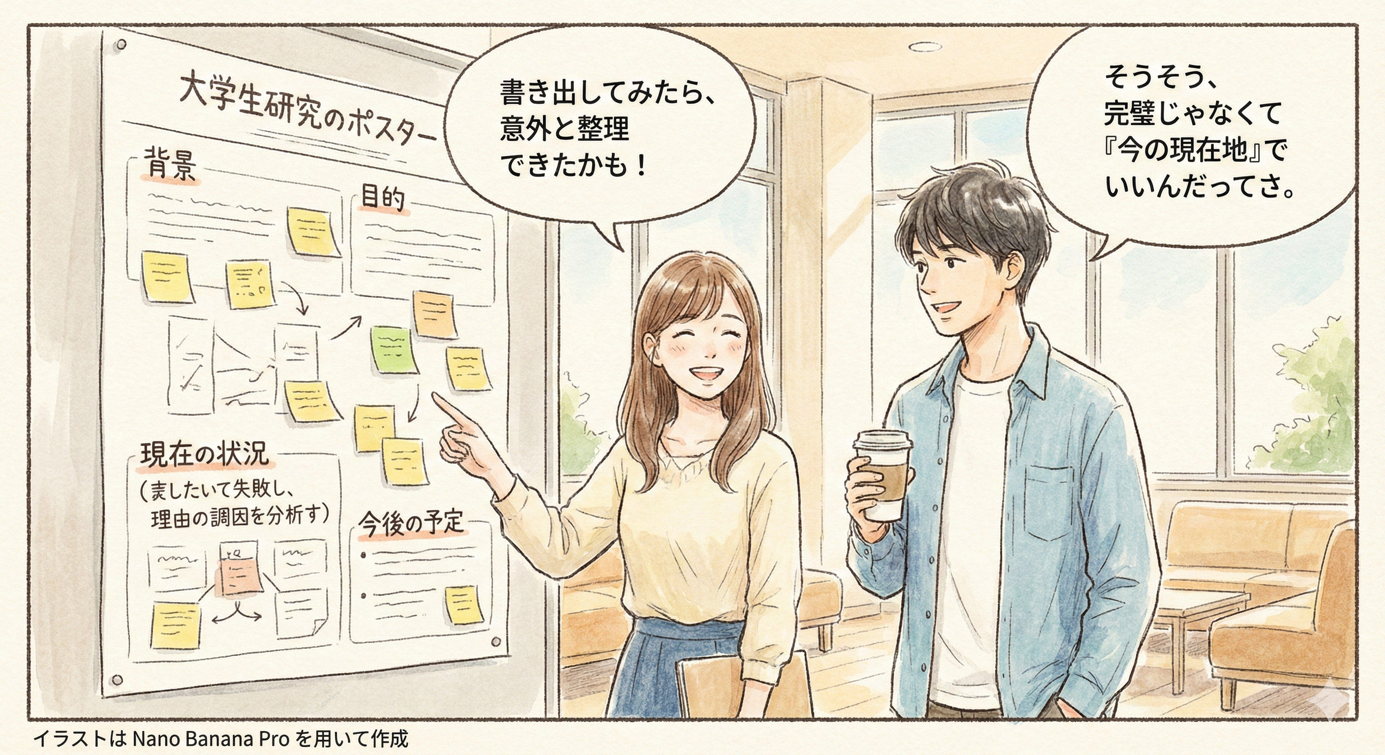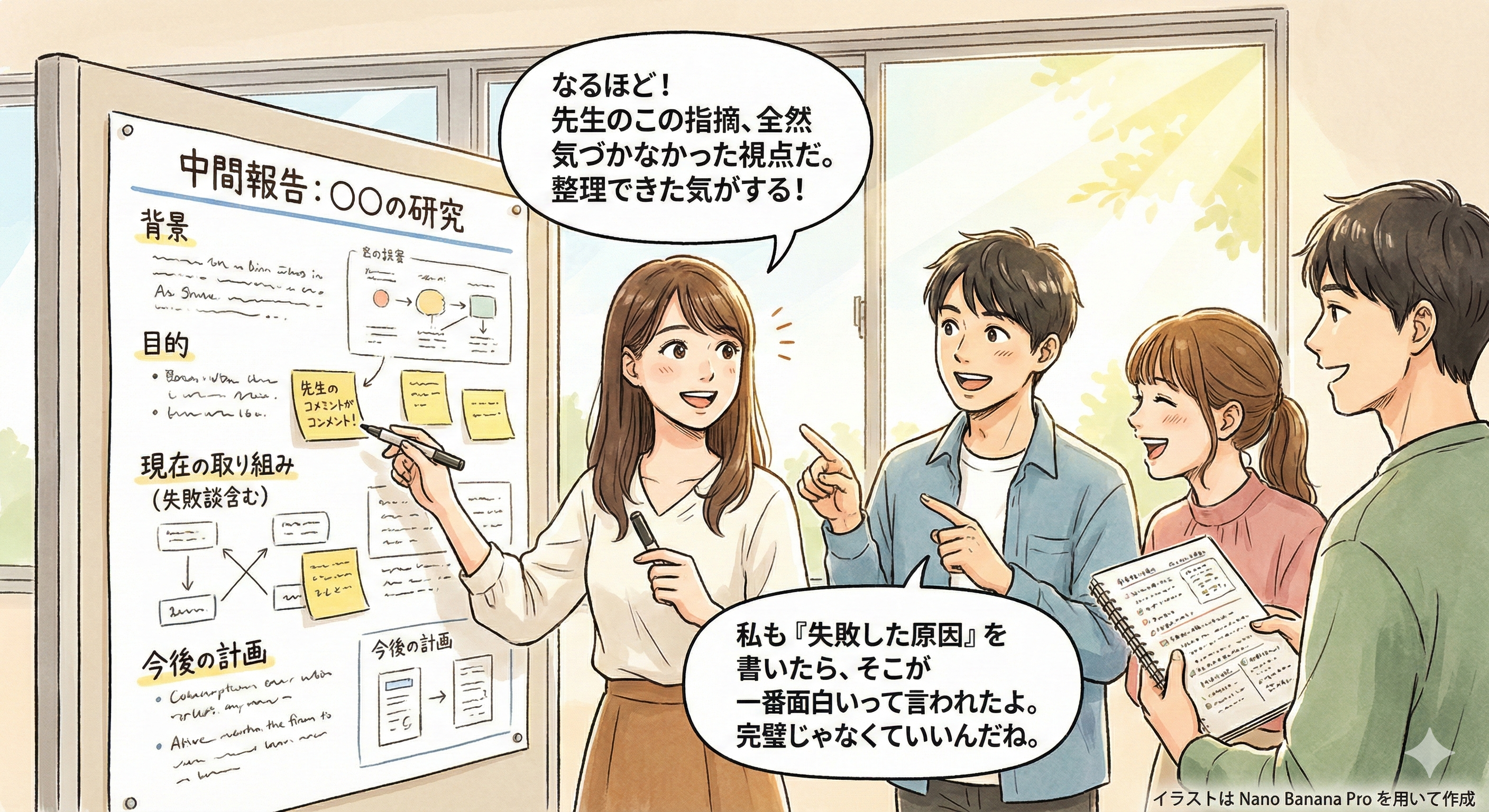 研究が計画通りに進まなくても,試行錯誤のプロセス自体が重要な学びである。 過度に心配せず,経験を次に活かすことが大切である。