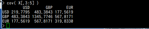 不偏分散共分散行列が結果として得られる. 結果が3行3列の配列になっている.