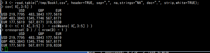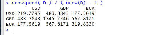crossprod( D ) / ( nrow(D) - 1 ) * この式は「t( D ) %*% t( D ) / ( nrow(D) - 1 )」と同じ意味