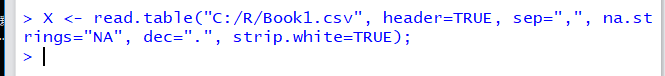 X <- read.table("/tmp/Book1.csv", header=TRUE, sep=",", na.strings="NA", dec=".", strip.white=TRUE);
