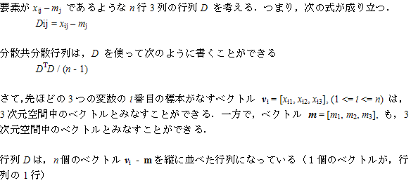 この Web ページの先頭で説明したように、不偏分散共分散行列は,「不偏分散を拡張した形の分散共分散行列」になっていることが分かります.