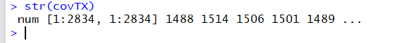 * 実は,covTX は,2834行2834列になっています. 長すぎるので,「covTX」+ Enter ではうまく表示できません.