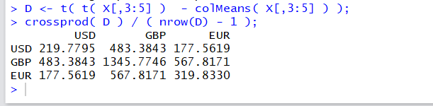 crossprod( D ) / ( nrow(D) - 1 ); * この式は「t( D ) %*% t( D ) / ( nrow(D) - 1 )」と同じ意味