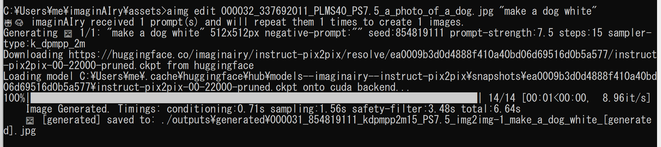 cd /d c:%HOMEPATH% cd imaginAIry cd assets aimg edit 000032_337692011_PLMS40_PS7.5_a_photo_of_a_dog.jpg "make a dog white"