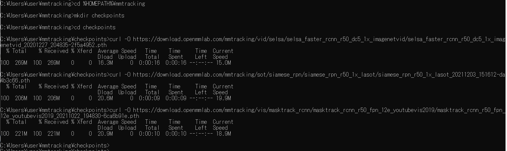 cd /d c:%HOMEPATH%\mmtracking mkdir checkpoints cd checkpoints curl -O https://download.openmmlab.com/mmtracking/vid/selsa/selsa_faster_rcnn_r50_dc5_1x_imagenetvid/selsa_faster_rcnn_r50_dc5_1x_imagenetvid_20201227_204835-2f5a4952.pth curl -O https://download.openmmlab.com/mmtracking/sot/siamese_rpn/siamese_rpn_r50_1x_lasot/siamese_rpn_r50_1x_lasot_20211203_151612-da4b3c66.pth curl -O https://download.openmmlab.com/mmtracking/vis/masktrack_rcnn/masktrack_rcnn_r50_fpn_12e_youtubevis2019/masktrack_rcnn_r50_fpn_12e_youtubevis2019_20211022_194830-6ca6b91e.pth