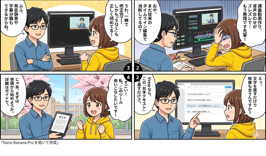 VrewはPDFスライドからAI音声付き動画を作成するソフトウェアである。テキストベース編集により、台本の修正が音声と映像に自動反映される。利用前に料金プラン、機密情報の取り扱い、技術的制限を確認すること。