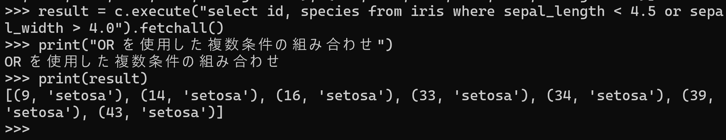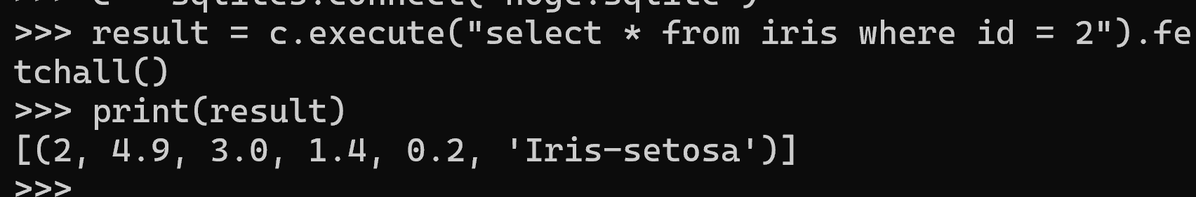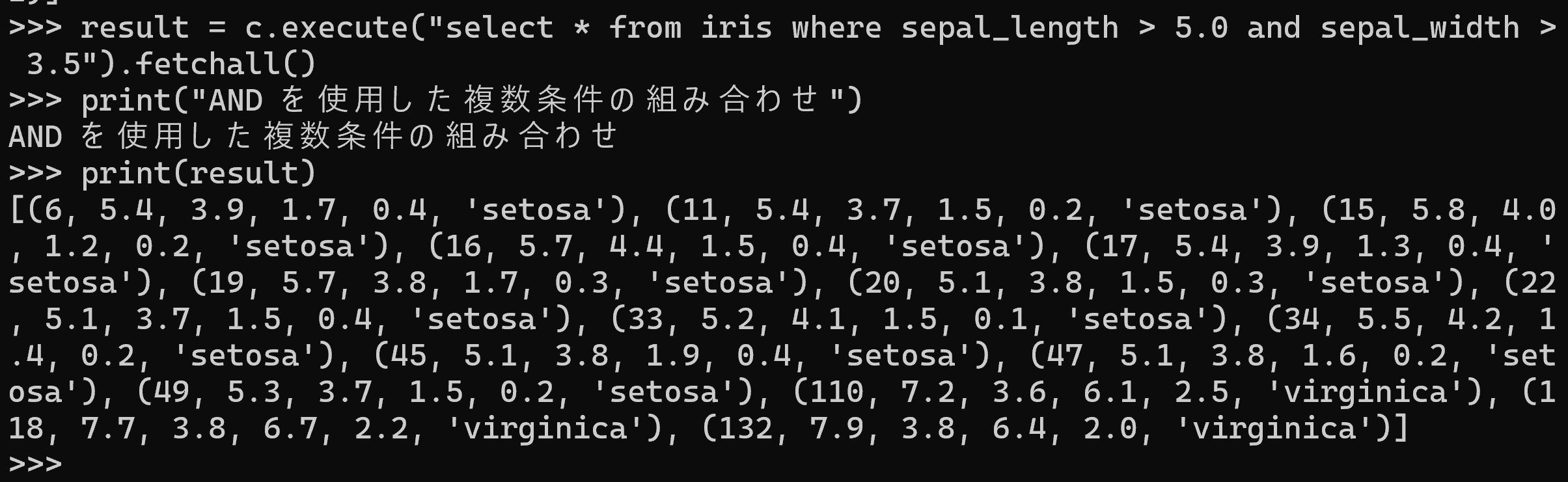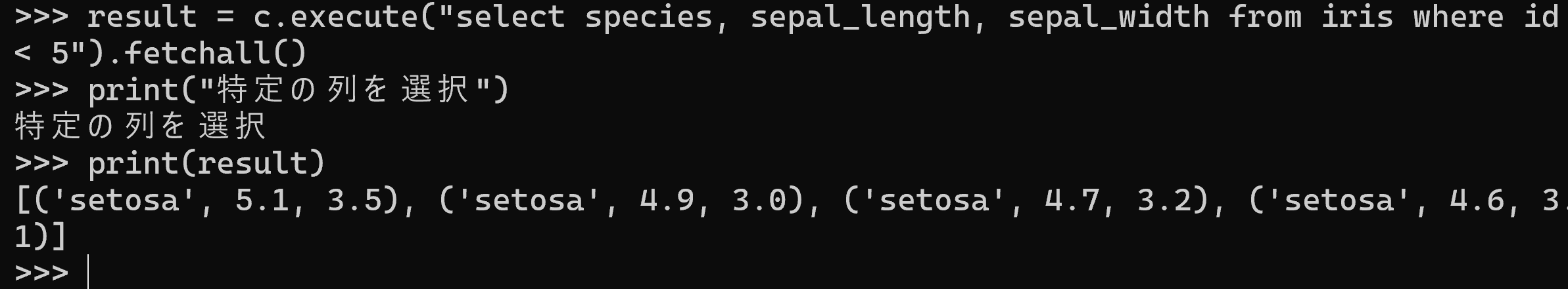 select * from iris は,iris テーブルの全行・全列を取得するSQL問い合わせである.問い合わせ結果を取得し,print で表示する.