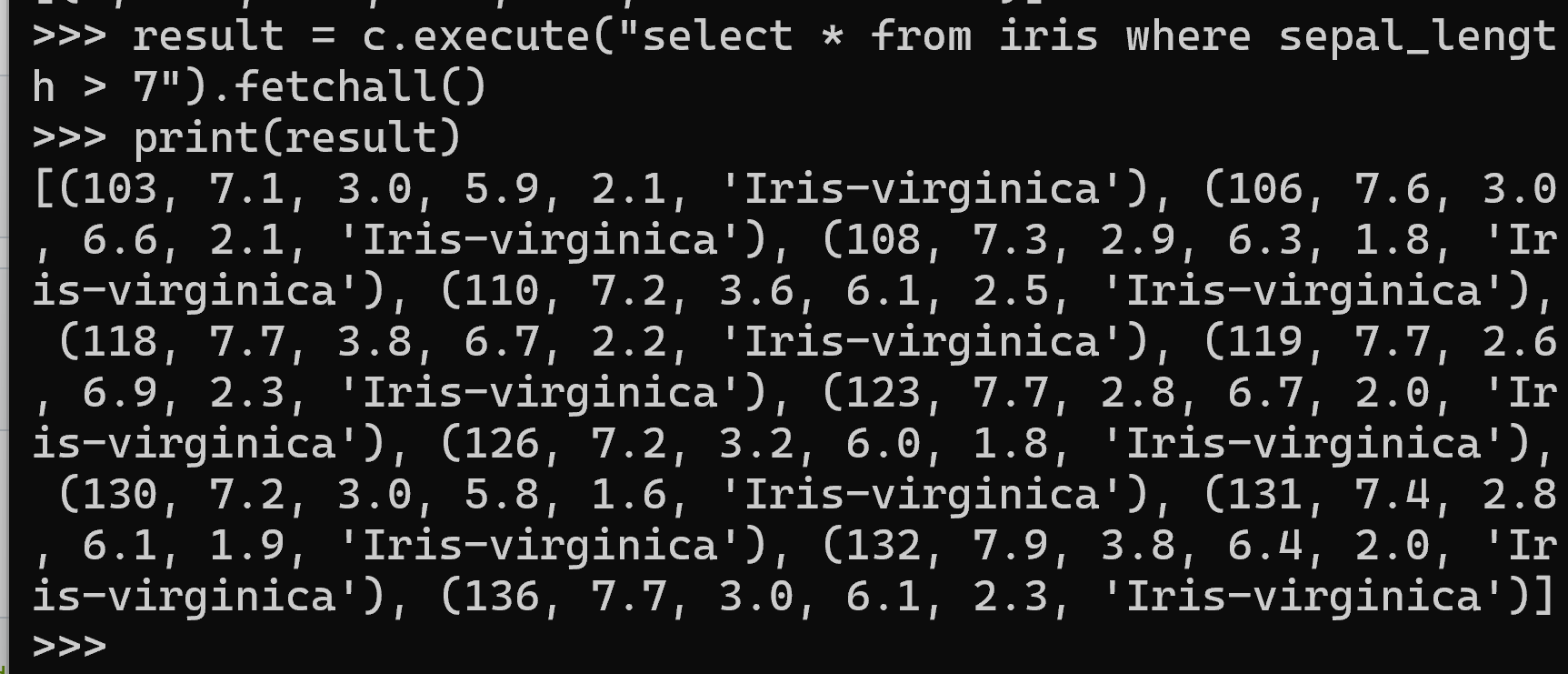 result = c.execute("select * from iris where sepal_length > 7").fetchall()