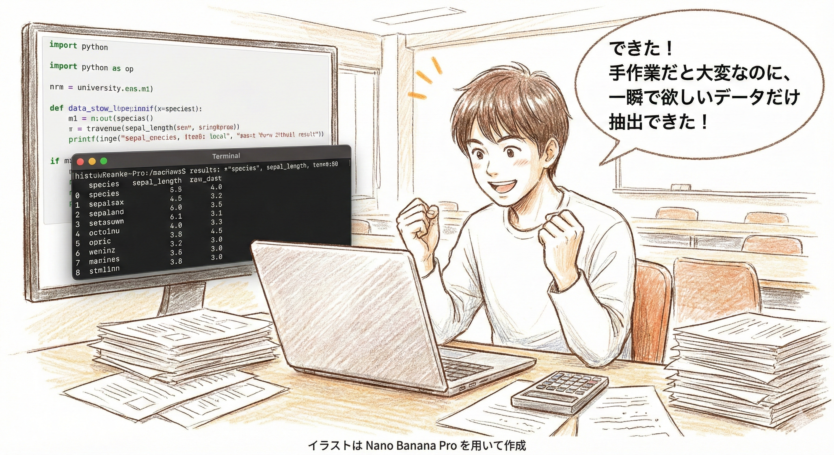 Python の標準ライブラリである urllib.request を使用して,GitHub 上で公開されている Iris データセットの CSV ファイルをダウンロードする.urllib.request.urlretrieve は,第1引数に指定した URL からファイルを取得し,第2引数に指定したファイル名でカレントディレクトリに保存する関数である.この方法により,外部サイトへのアカウント登録なしにデータを取得できる.