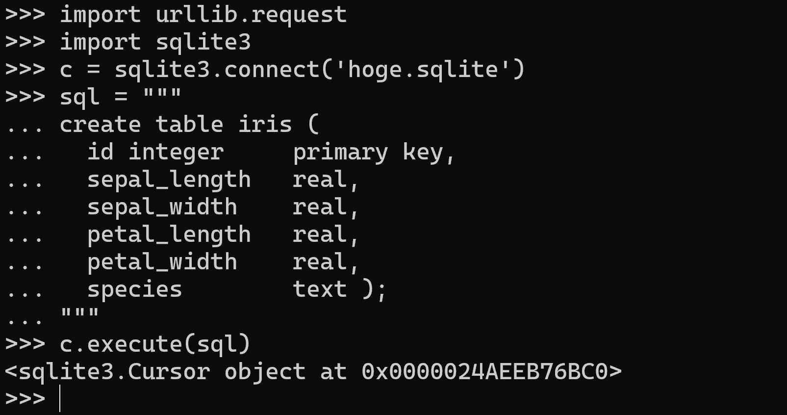 以下のプログラムでは,sqlite3.connect でSQLite3データベースに接続し,接続オブジェクト c を取得する.SQLite3はファイルベースのデータベースであるため,接続時にはデータベースファイルのパス(ここでは 'hoge.sqlite')を指定する.接続オブジェクトは,SQL文の実行やトランザクション(一連のデータベース操作をまとめて確定または取り消す仕組み)の管理に用いる.create table 文でテーブル iris を定義し,各列にデータ型を指定する.id 列には主キー制約(primary key)を設定する.トリプルクォート(""" … """)を用いることで,複数行のSQL文を見やすく記述している.なお,ここでは接続オブジェクト c の execute メソッドでSQL文を直接実行している.(これは sqlite3 モジュールが提供するショートカットであり,内部的にはカーソルが自動生成される.)