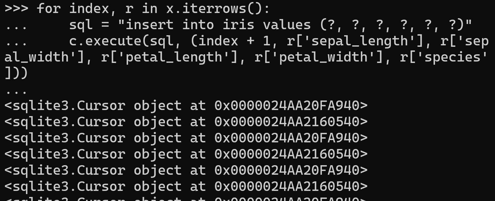 c.execute(sql, (index + 1, r['sepal_length'], r['sepal_width'], r['petal_length'], r['petal_width'], r['species']))