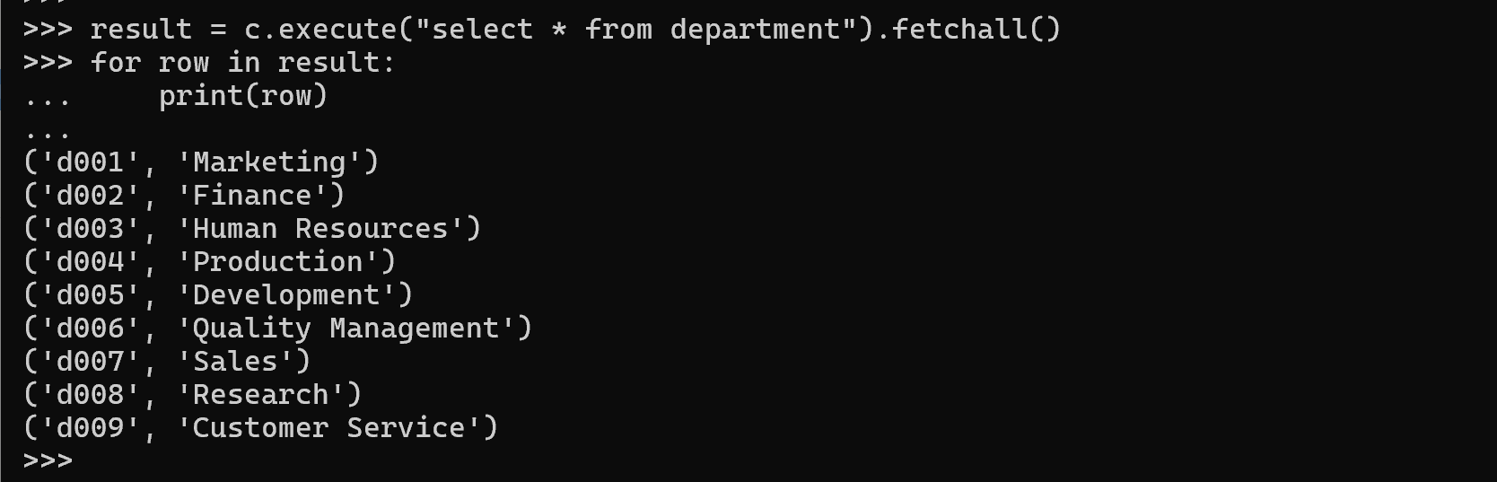 result = c.execute("select * from department").fetchall()