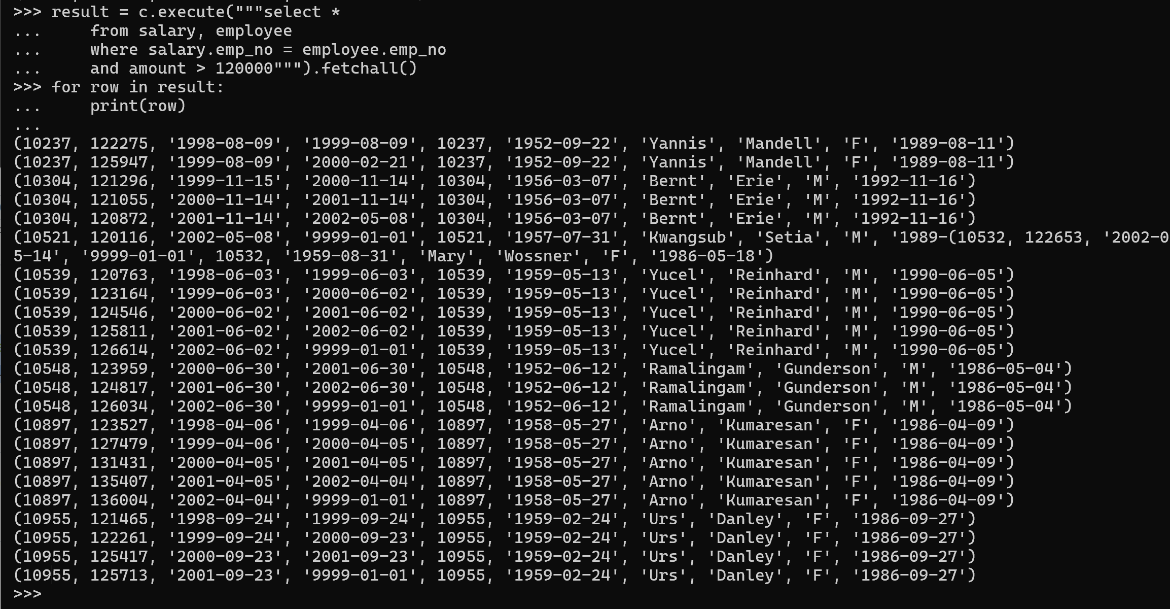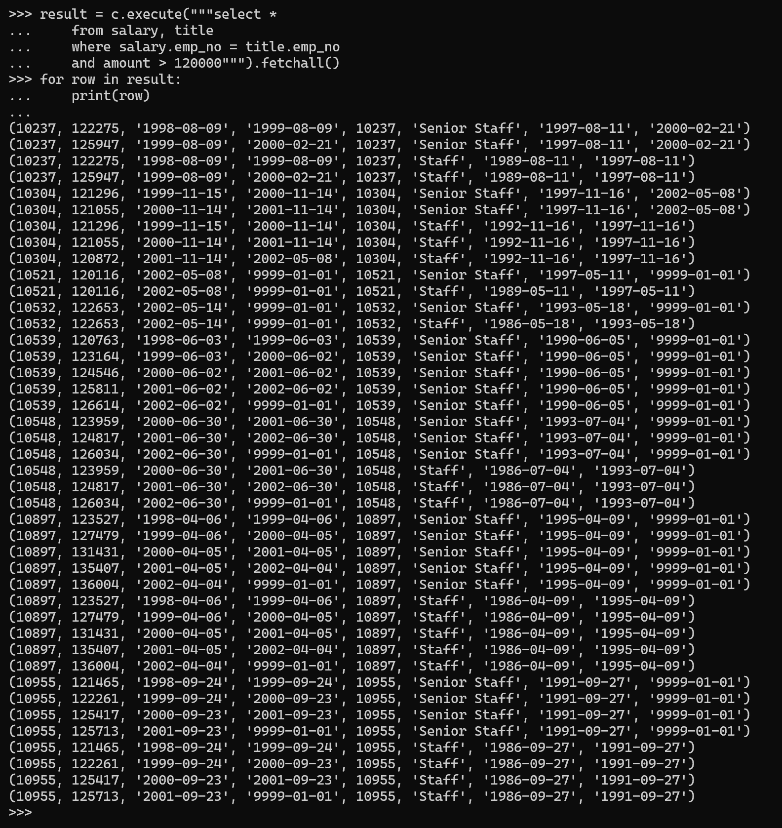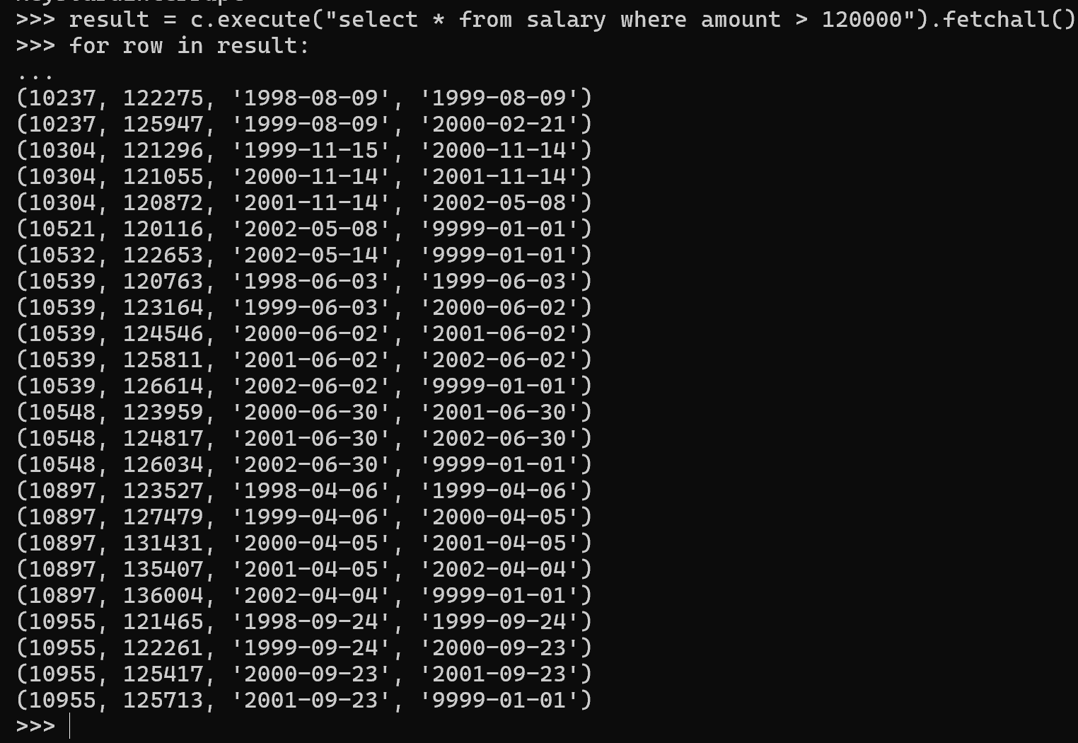 result = c.execute("select * from salary where amount > 120000").fetchall()