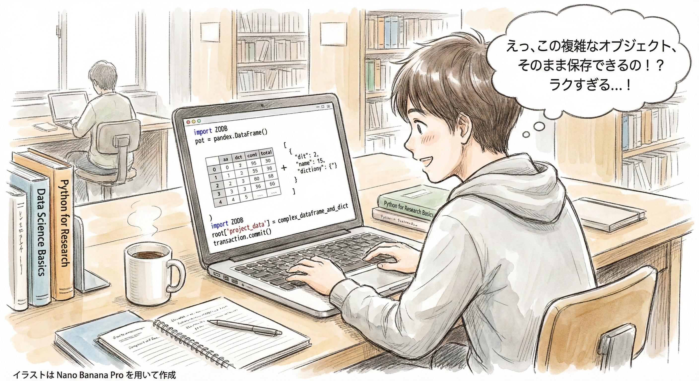 ZODBは,Pythonオブジェクトの永続化に特化したデータベースシステムである.オブジェクトリレーショナルマッピング(オブジェクトとリレーショナルデータベース間のデータ変換)を必要とせず,トランザクション(データベース操作の一貫性を保証する仕組み)機能を備えている.