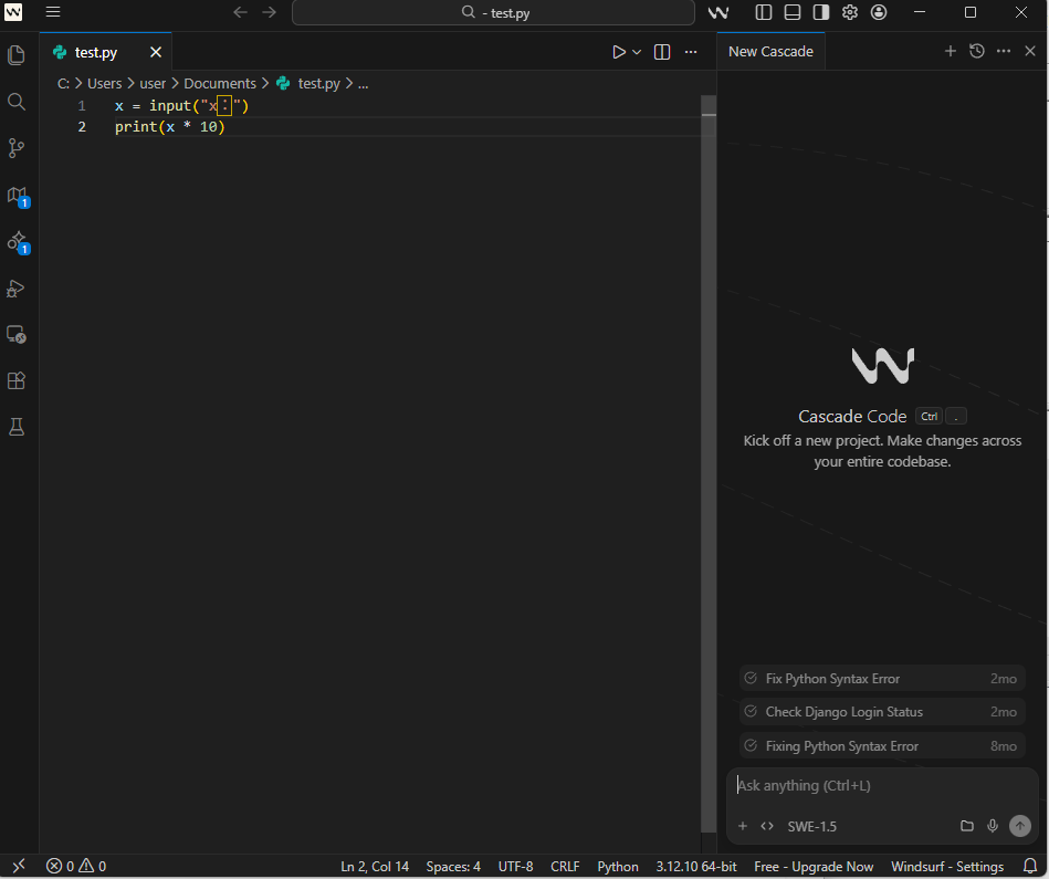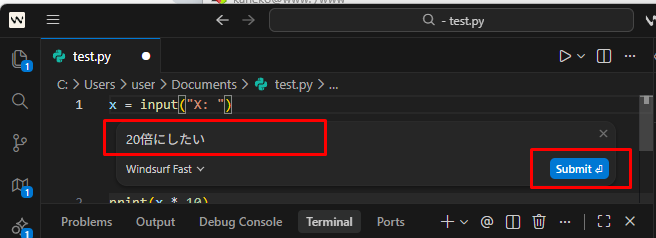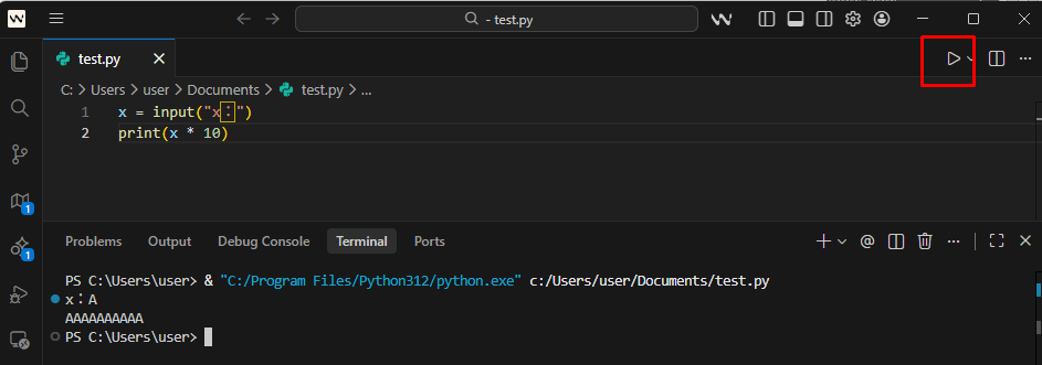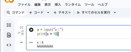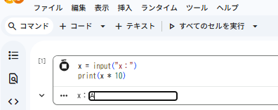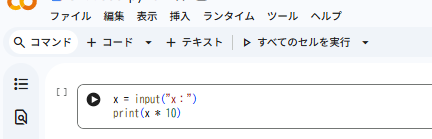 x = input("x:") print(x * 10) - セルの左にある ▷(実行ボタン)をクリックするか、Shift + Enter を押す