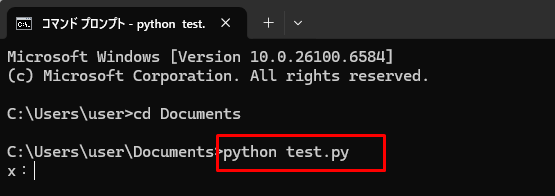 .pyにして保存する。メモ帳で保存する場合、ファイルの種類を「すべてのファイル」にしないと.txtが付く点に注意。 - Pythonプログラムの実行:コマンドプロンプトで
