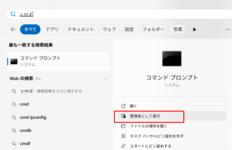 - コマンドプロンプトを管理者として実行する(8章 8.2節参照)