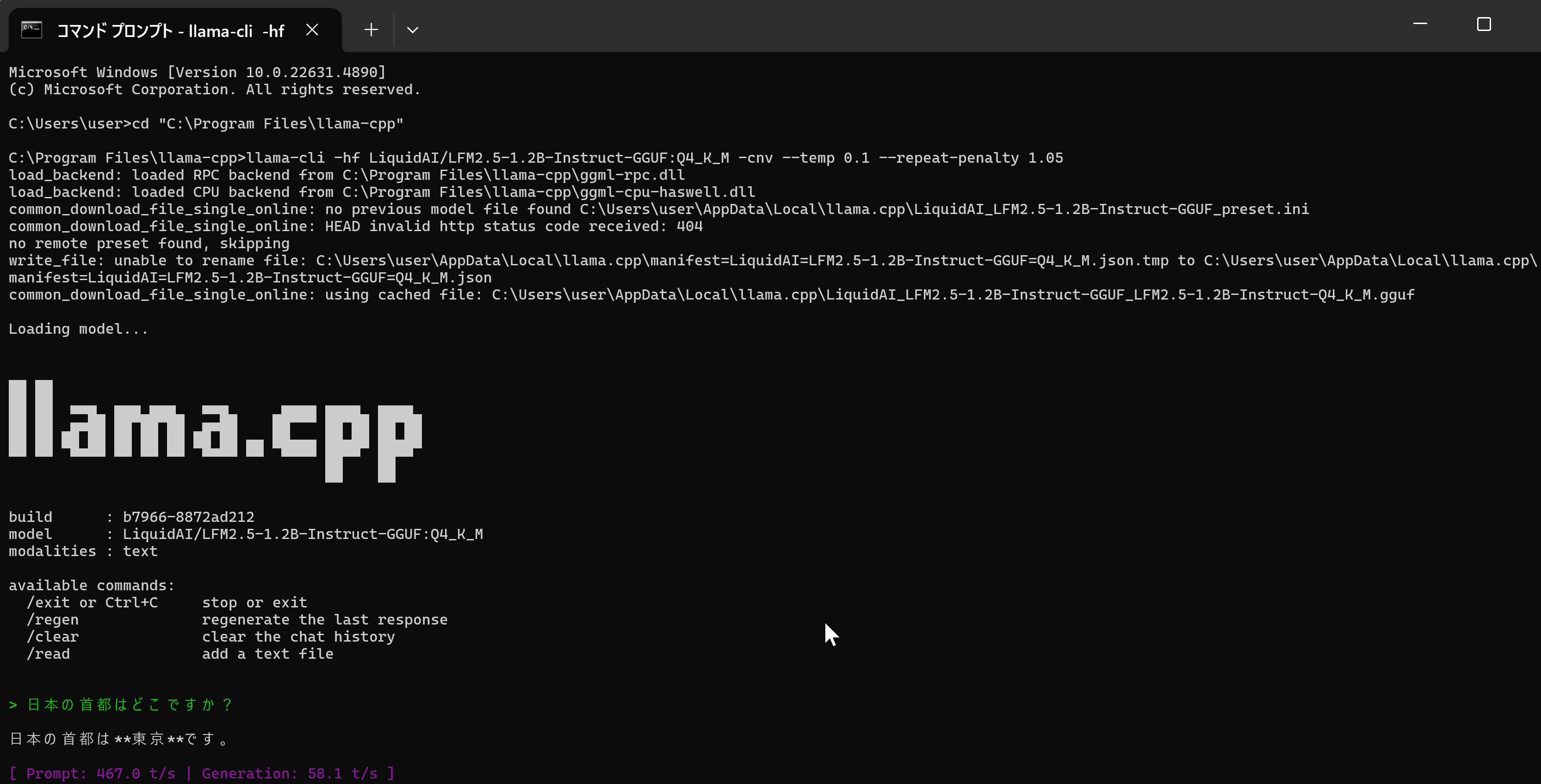 LFM2.5のGGUF版で動作確認を行う。対話モードで使用する場合は以下のコマンドを実行する。-hfオプションにより、初回実行時にHugging FaceからGGUFファイル(Q4_K_M: 731MB)が自動的にダウンロードされる。