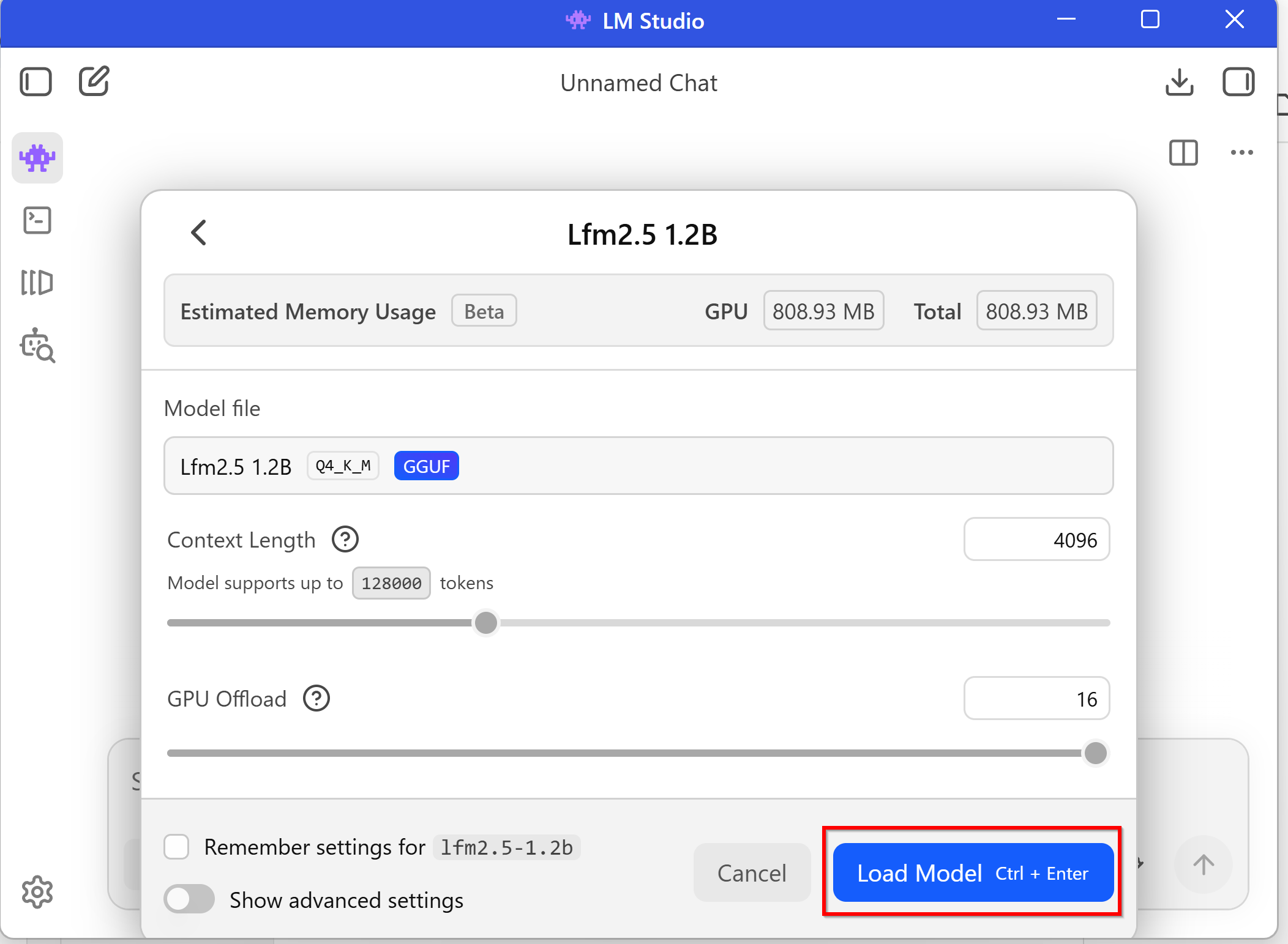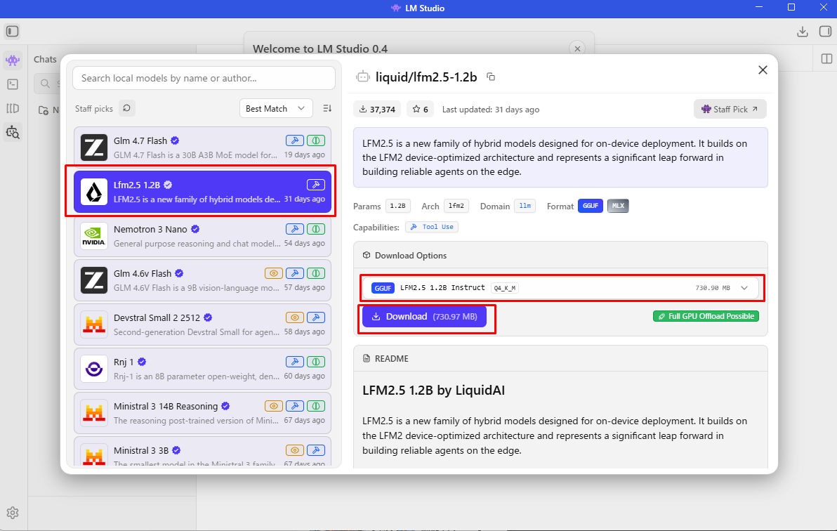 LFM2.5で動作確認を行う。LM Studio を起動し、検索バー(Ctrl+Shift+Mでモデル管理画面を開く)で「LFM2.5」と検索し、LFM2.5-1.2B-Instruct-GGUF(Q4_K_M推奨、約731MB)をダウンロードする。