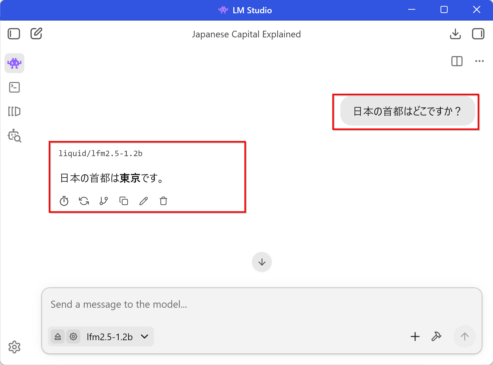 任意の質問を入力する(例:「日本の首都はどこですか?」)。応答が表示されれば正常である。