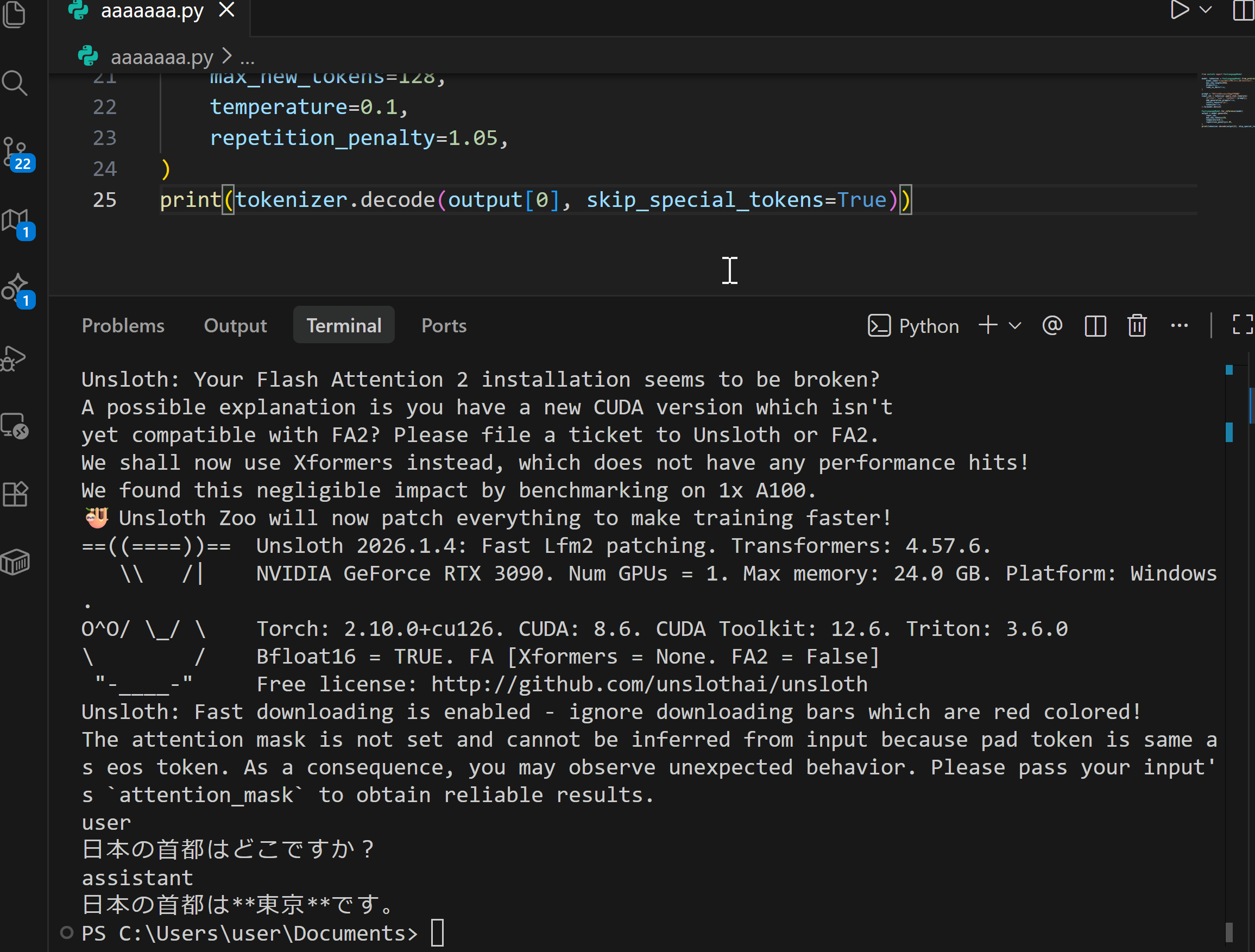 LFM2.5をunslothで読み込んで動作確認を行う。動作にはGPUが必要である。