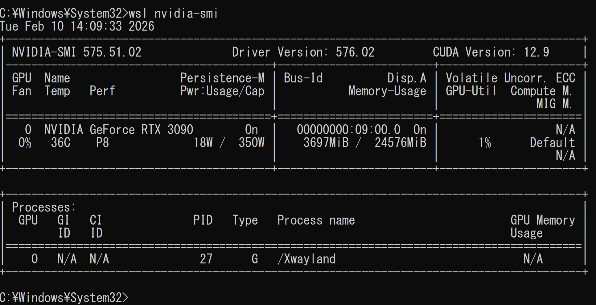 Windows側にNVIDIAドライバがインストールされていれば、WSL2からGPUを利用できる。以下をWSL内で実行して確認する。