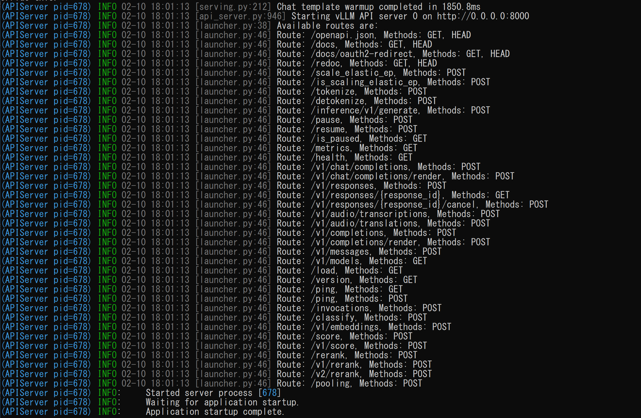 Python の仮想環境の作成と vllm のインストール。それを用いたOpenAI互換のAPIサーバーを起動を行う。