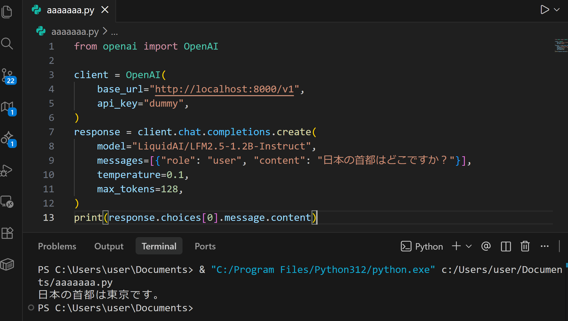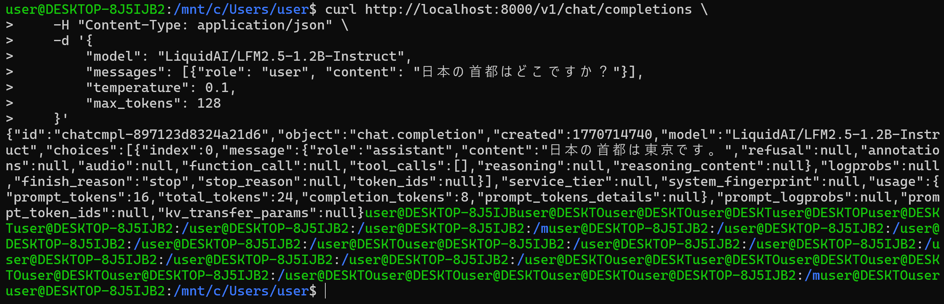 wsl bash curl http://localhost:8000/v1/chat/completions \ -H "Content-Type: application/json" \ -d '{ "model": "LiquidAI/LFM2.5-1.2B-Instruct", "messages": [{"role": "user", "content": "日本の首都はどこですか?"}], "temperature": 0.1, "max_tokens": 128 }'