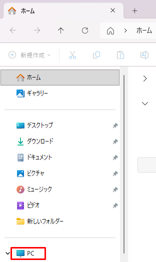 Windows + Eキーでエクスプローラーを起動し、左側のナビゲーションペイン(フォルダやドライブの一覧が並ぶ縦長の領域)で「PC」を選択する。