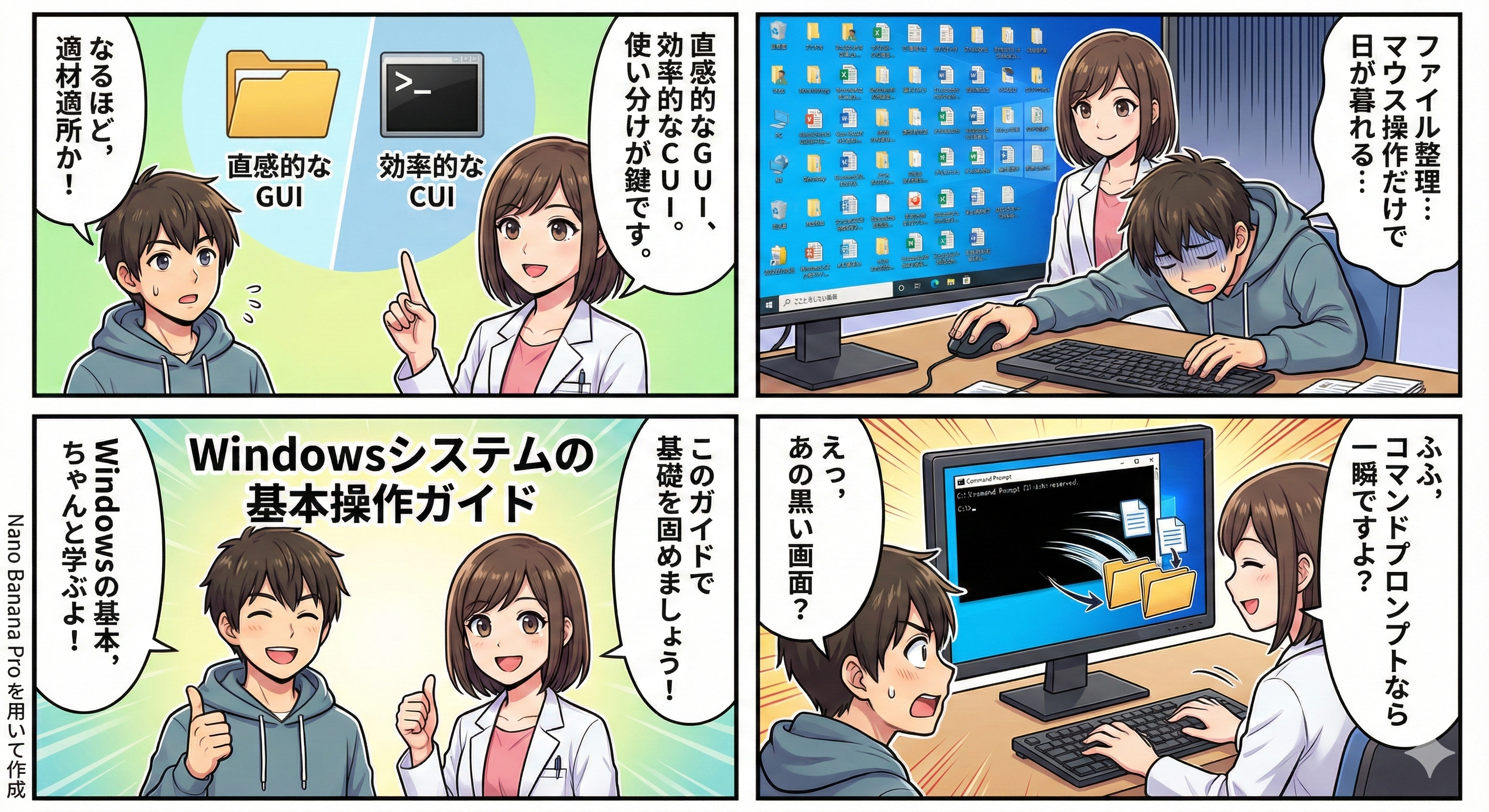 - GUI / CUI(CLI): マウスで視覚的に操作する方式(GUI)と、キーボードで文字入力して操作する方式(CUI/CLI)。Windowsではウィンドウ操作とコマンドプロンプトを使い分ける。