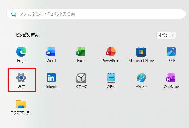 - Windowsのスタートメニューから「設定」をクリックする