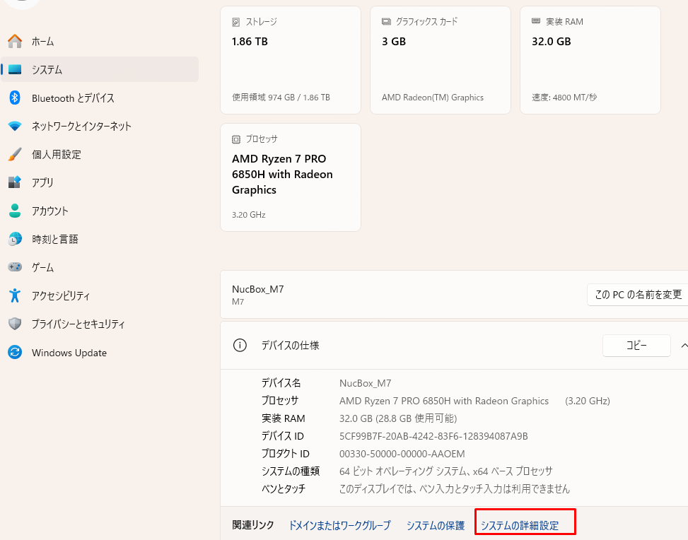- 「システムの詳細設定」ボタンをクリックする