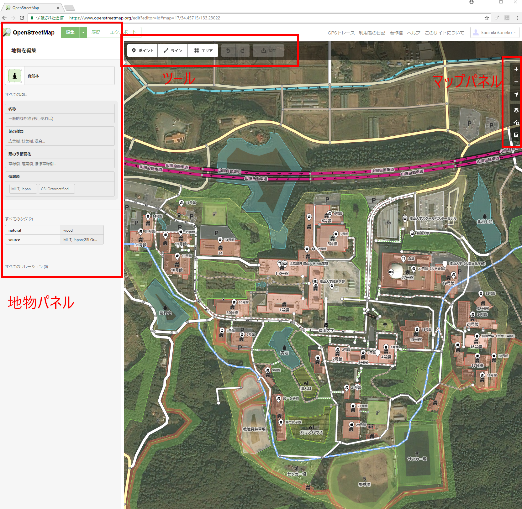 - OpenStreetMapサイトで表示される写真(航空写真など)をなぞって,ポイント,ライン,エリアなどの情報を入れていくことはOK.