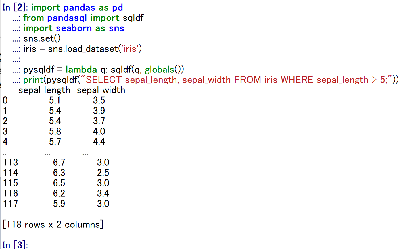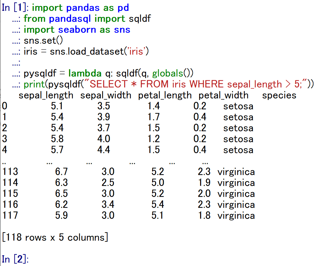 import pandas as pd from pandasql import sqldf import seaborn as sns sns.set() iris = sns.load_dataset('iris') pysqldf = lambda q: sqldf(q, globals()) print(pysqldf("SELECT * FROM iris WHERE sepal_length > 5;"))