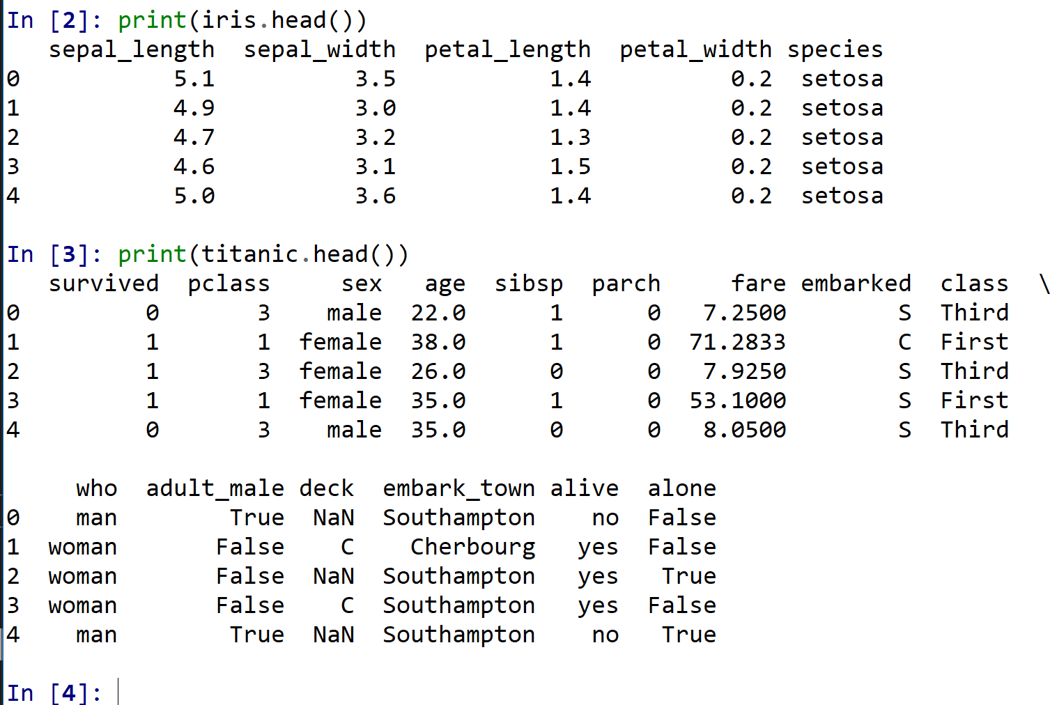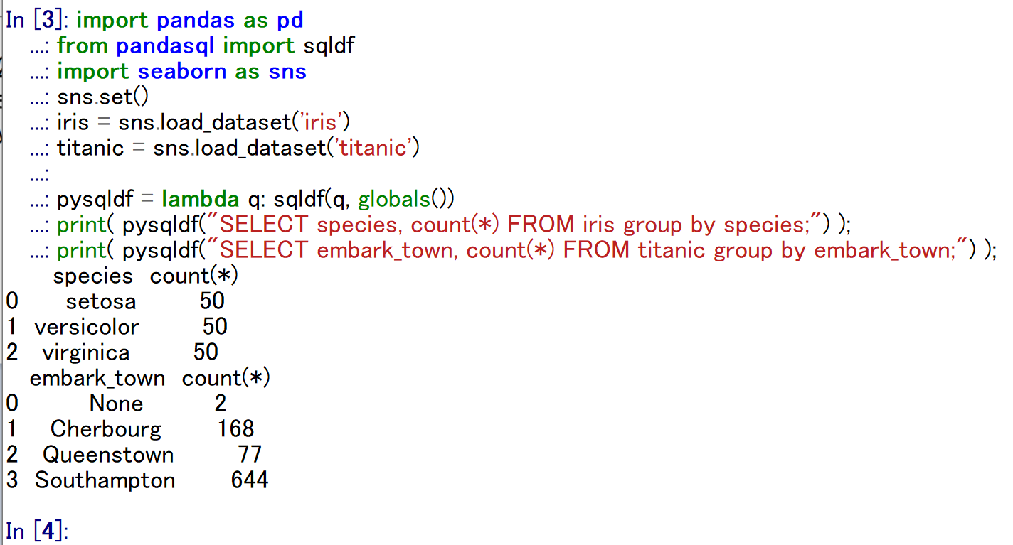 import pandas as pd from pandasql import sqldf import seaborn as sns sns.set() iris = sns.load_dataset('iris') titanic = sns.load_dataset('titanic') pysqldf = lambda q: sqldf(q, globals()) print( pysqldf("SELECT species, count(*) FROM iris group by species;") ); print( pysqldf("SELECT embark_town, count(*) FROM titanic group by embark_town;") );