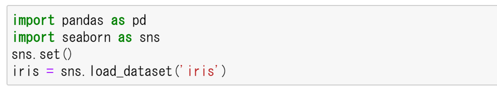 | Iris データセットの読み込み | sns.load_dataset('iris') により DataFrame が取得され,iris.head() で先頭5行が表示される |