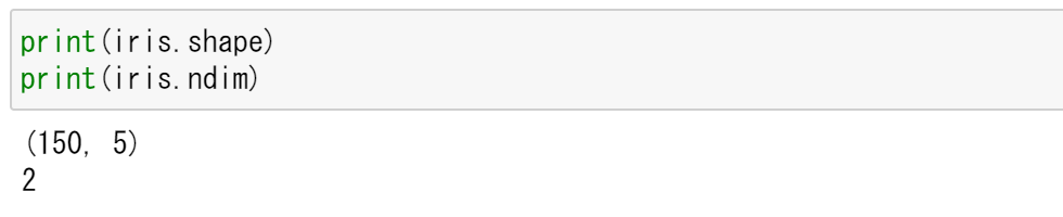| データの形の確認 | iris.shape が (150, 5),iris.ndim が 2 と表示される |