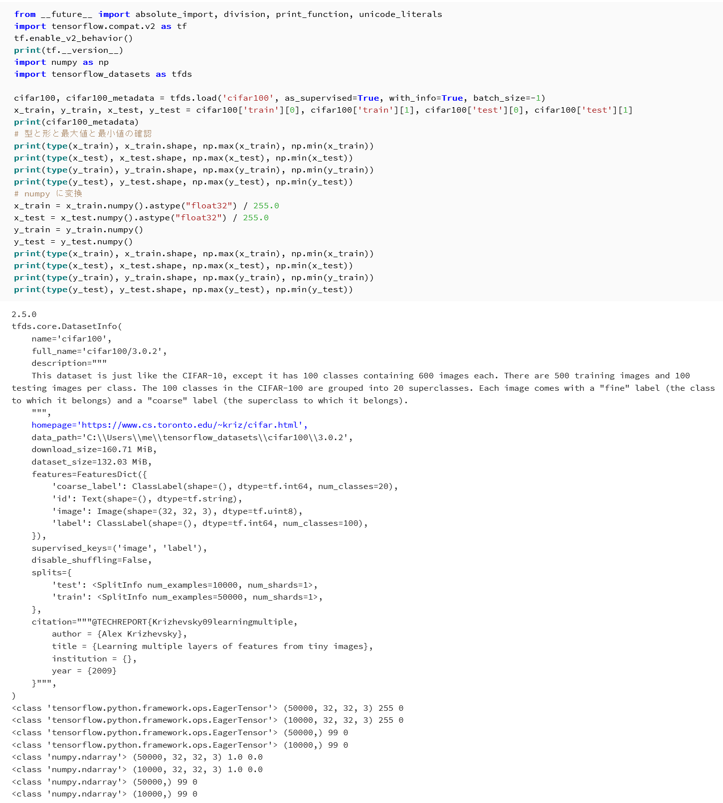 | CIFAR100 データセットのロード | メタデータ,x_train, x_test, y_train, y_test の型・形状・最大値・最小値が表示される |