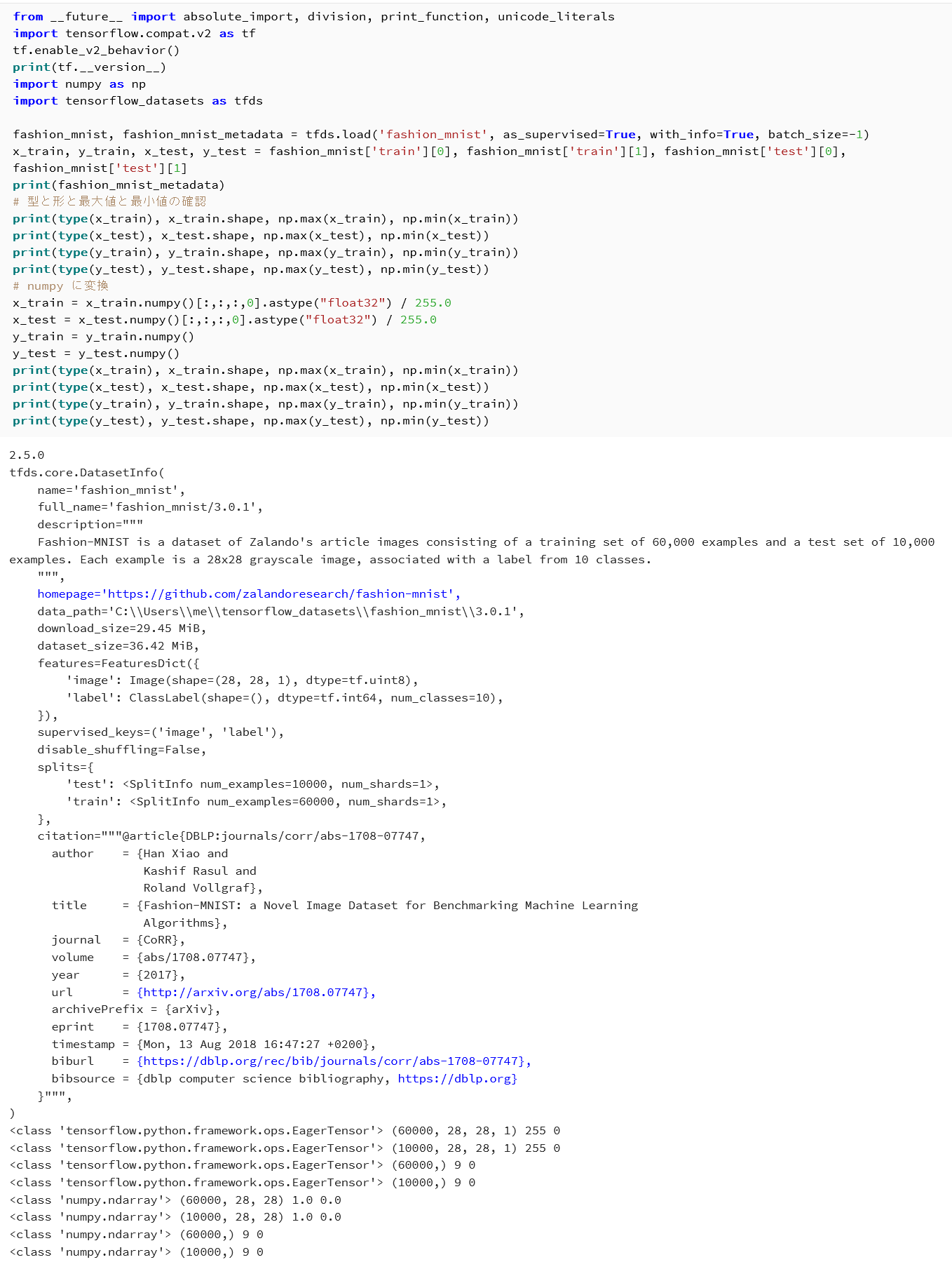 | Fashion MNIST データセットのロード | メタデータ,x_train, x_test, y_train, y_test の型・形状・最大値・最小値が表示される |