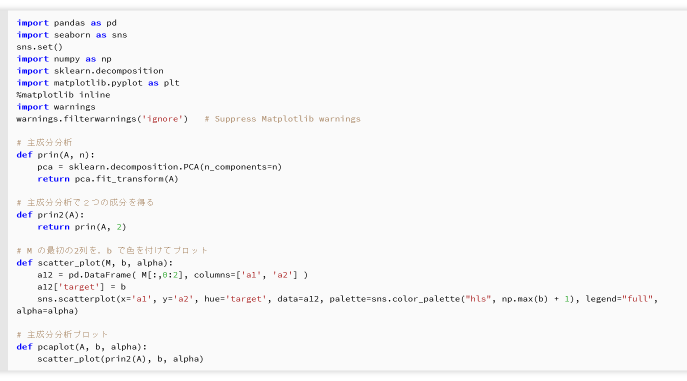| 前準備セル(インポートと関数定義)の実行 | エラーなく完了し,prin,pcaplot,load_dataset の各関数が定義される |