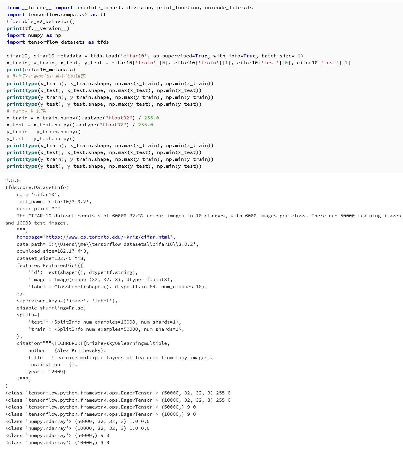| CIFAR10 データセットのロード | メタデータ,x_train, x_test, y_train, y_test の型・形状・最大値・最小値が表示される |