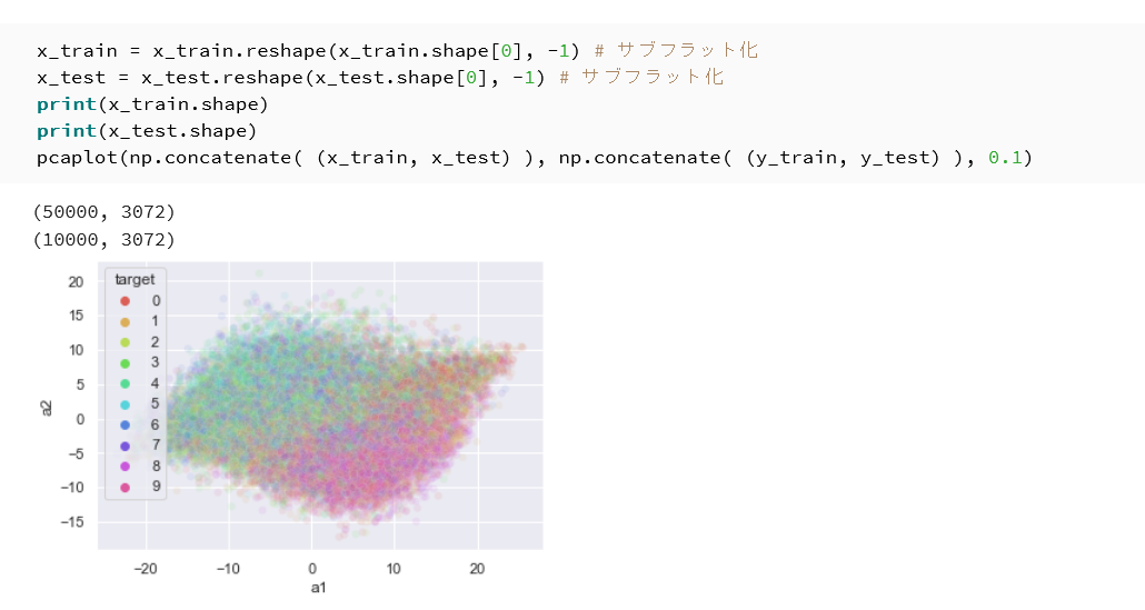 | CIFAR10 の主成分分析プロット | フラット化後の形状が表示され,10クラスの色分け散布図と寄与率が出力される |