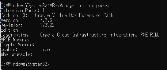 インストール済みの拡張パック一覧が表示される。Usable が true であれば正常に動作している。