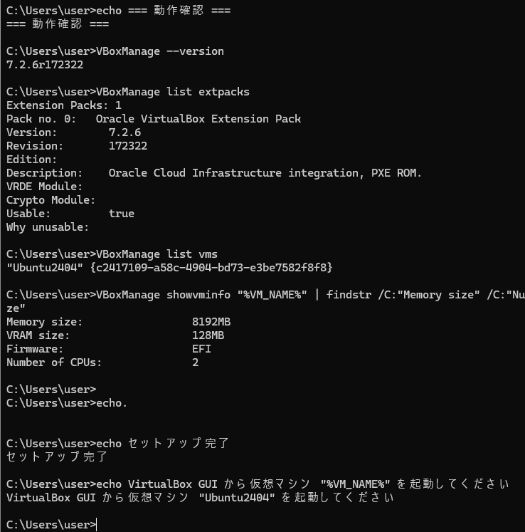 | 使用ツール | winget(パッケージ管理)、VBoxManage(VM管理)、xorriso(ISO編集) |