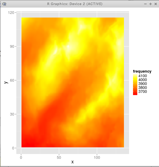 ggplot(T, aes(x=x, y=y, fill=val)) + geom_tile() + scale_fill_gradientn("frequency", colours = c)