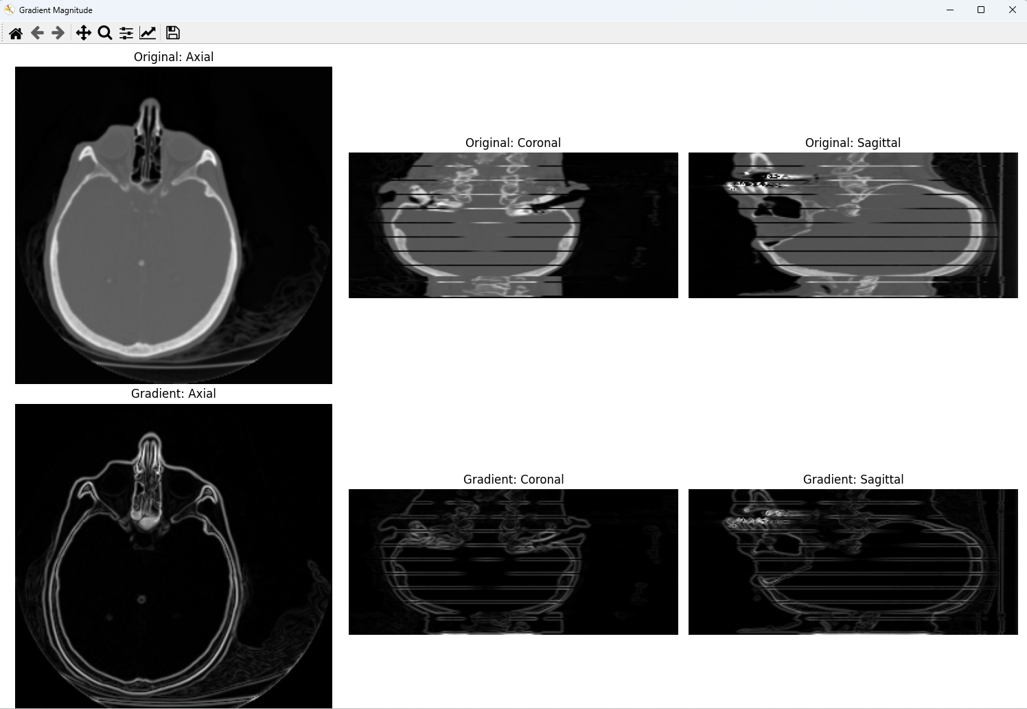 勾配は、各点における輝度値の変化率を表すベクトルである。3次元データでは、x・y・z各軸方向の偏微分を計算し、その大きさ(magnitude)を求めることで、輝度変化の激しさを可視化できる。