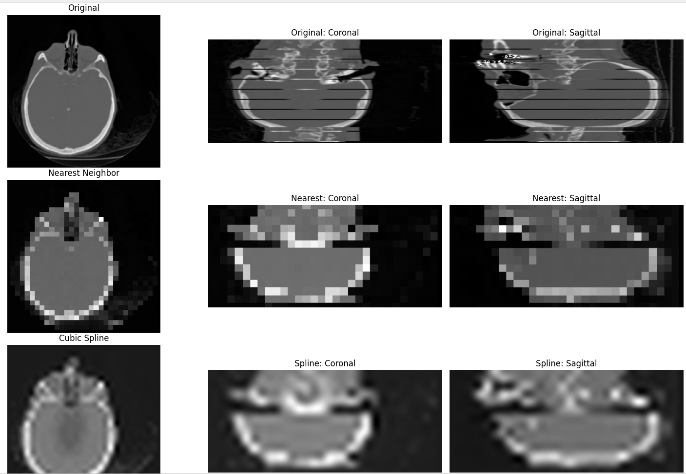 補間は、離散的なデータ点の間を滑らかにつなぎ、解像度を変更する処理である。本プログラムでは、データを1/8に縮小した後、8倍に拡大して元サイズに戻す。最近傍補間(order=0)と3次スプライン補間(order=3)の結果を比較する。