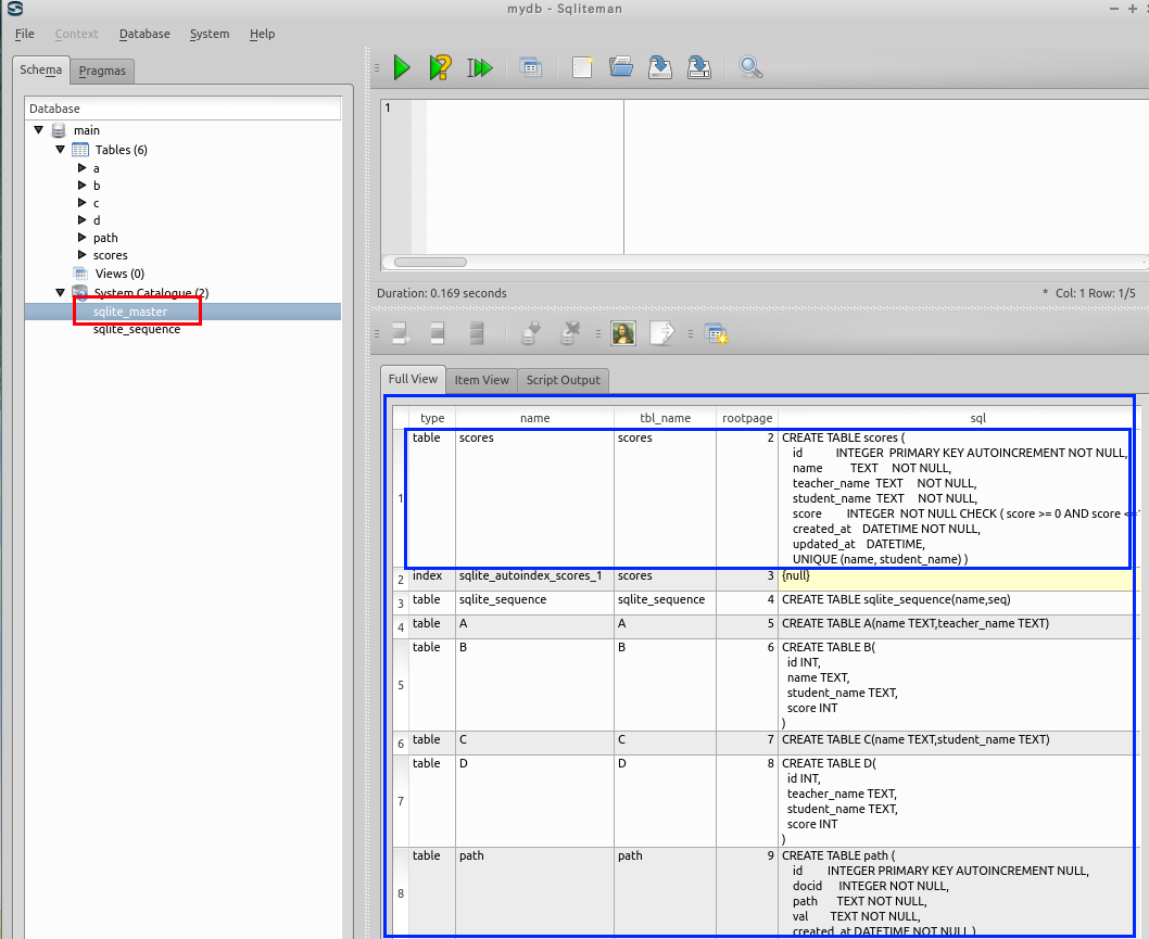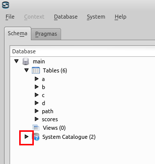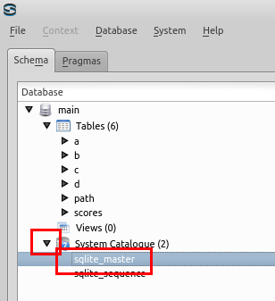 - 「System Catalogue」を展開し,「sqlite_master」をクリックすると,データベース・スキーマ (database schema) が表示されるので,scores の行を確認する.
