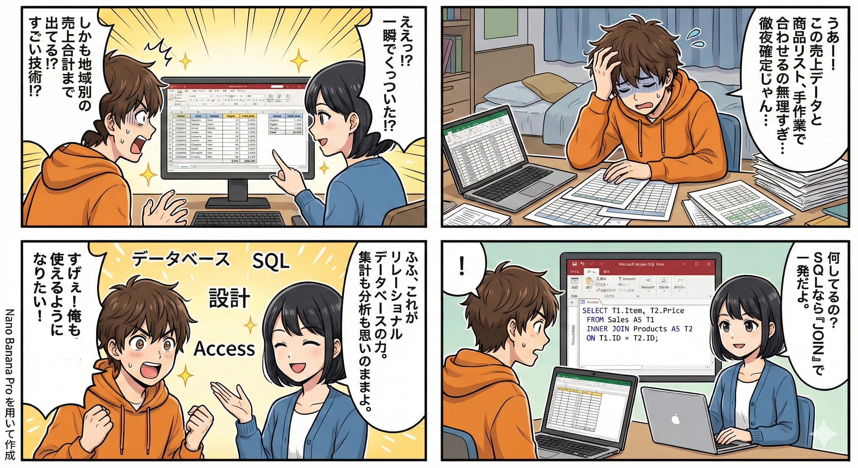 | de-6 | テーブル結合とSQLによるデータ統合 | INNER JOIN、ON句、Accessの制約とWHERE句による代替 |